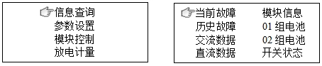 ?在主菜單頁面,通過上,下鍵選擇子菜單,如選擇“信息查詢”,“參數設置”,“參數查詢”,按確認鍵,會彈出一個新的菜單頁面。按取消鍵,則返回到主頁面。