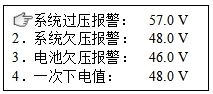 若用戶需要恢復到出廠設置值時,請按住“UP”或“DOWN”鍵重新啟動監控即可恢復,按住“UP”鍵重啟,將恢復到48V50A系統的出廠值,按住“DOWN”鍵重啟,將恢復到48V30A系統的出廠值。