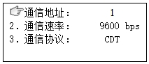 ?通信設置,設定系統地址,通信速率和通信協議,通信速率包括1200、2400、4800、9600,通信協議包括CDT、ModBus。